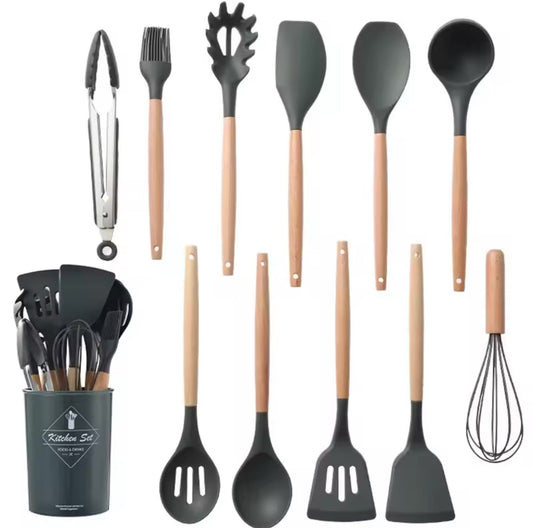 Set Cucina : 11 utensili in silicone con manico in legno e porta utensili incluso | Maxistore™
