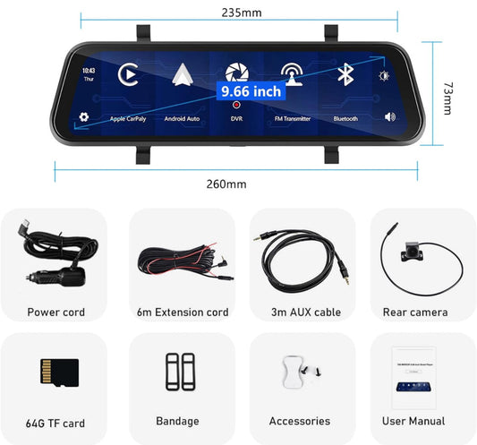 Specchietto retrovisore 9.66 pollici dashcam 1080P con carplay |Maxistore™